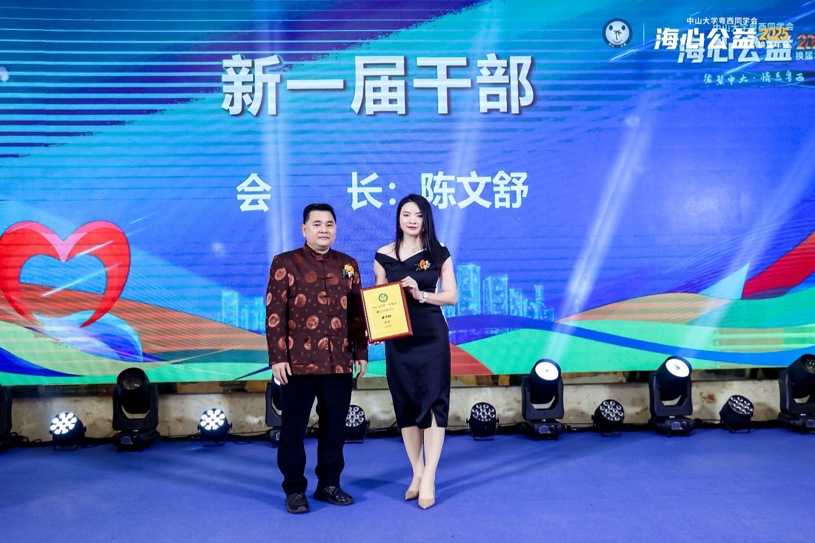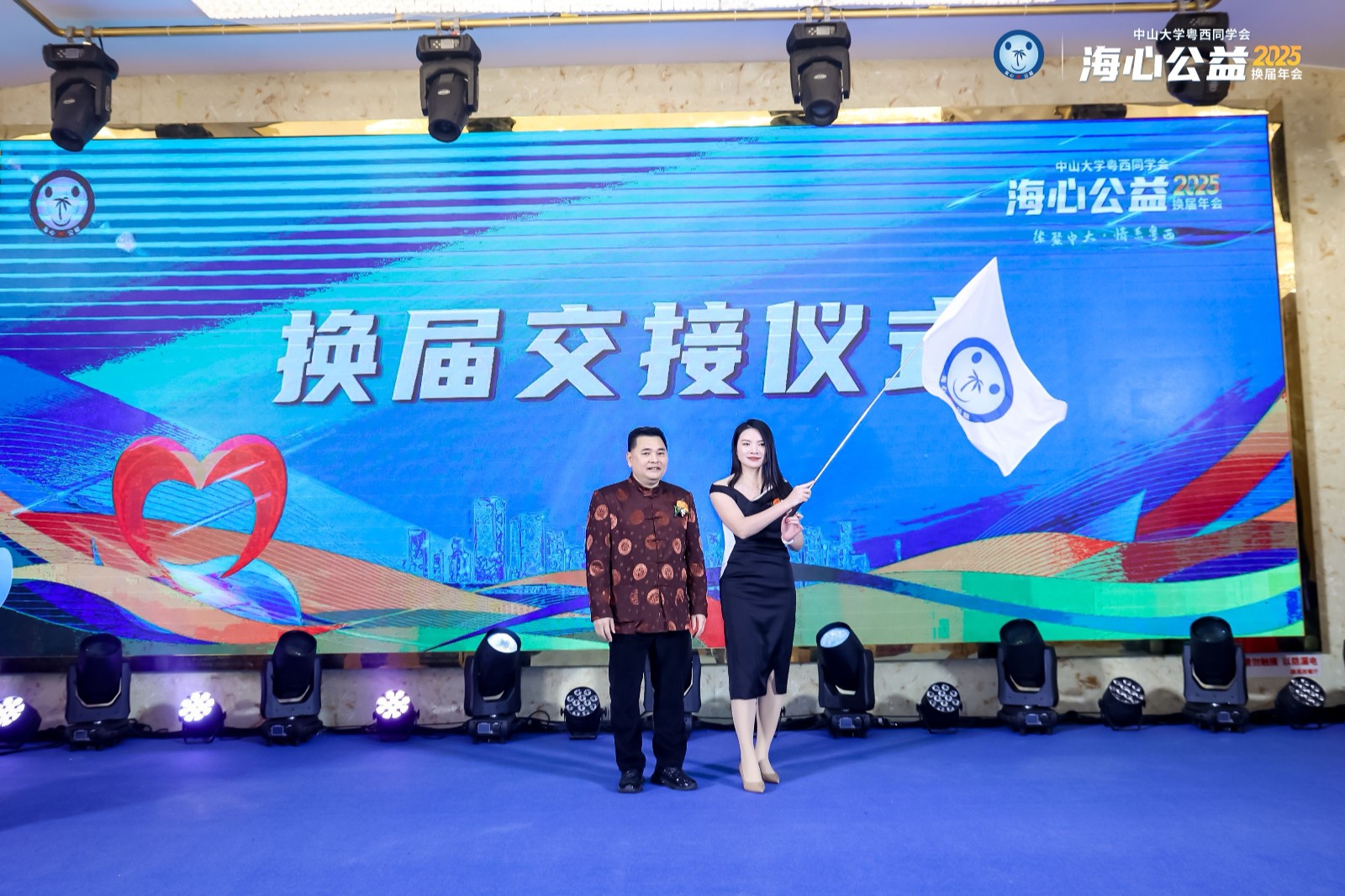 晚会现场,海心公益创会会长冯学昌先生将象征责任与传承的会旗郑重交予陈文舒女士。作为欢创集团的党支部书记、总裁,陈文舒女士始终秉持“企业发展与社会责任并重”的理念,带领企业稳健前行的同时,躬身践行公益使命,她用实际行动诠释了海心公益“以爱为舵,以信为帆,恪守责任,服务社会”的使命。她在履新致辞中表示,将不负众望,履行会长职责,凝聚更多力量,激发更大能量,携手各位校友和爱心人士,共同推动海心公益事业的发展。