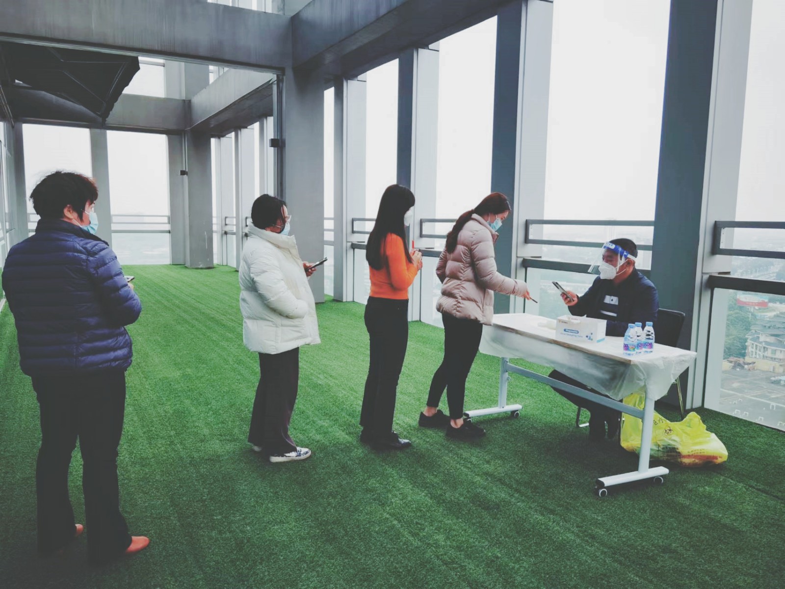 检测现场,企业严格按照有关要求,检测点安排在通风透气的露台,保持间隔,确保不扎堆,安排员工以5人一组前往指定地点进行采集。员工在人事行政部工作人员的引导和组织下,检测时按照规定,登记个人信息,整个检测过程有条不紊。